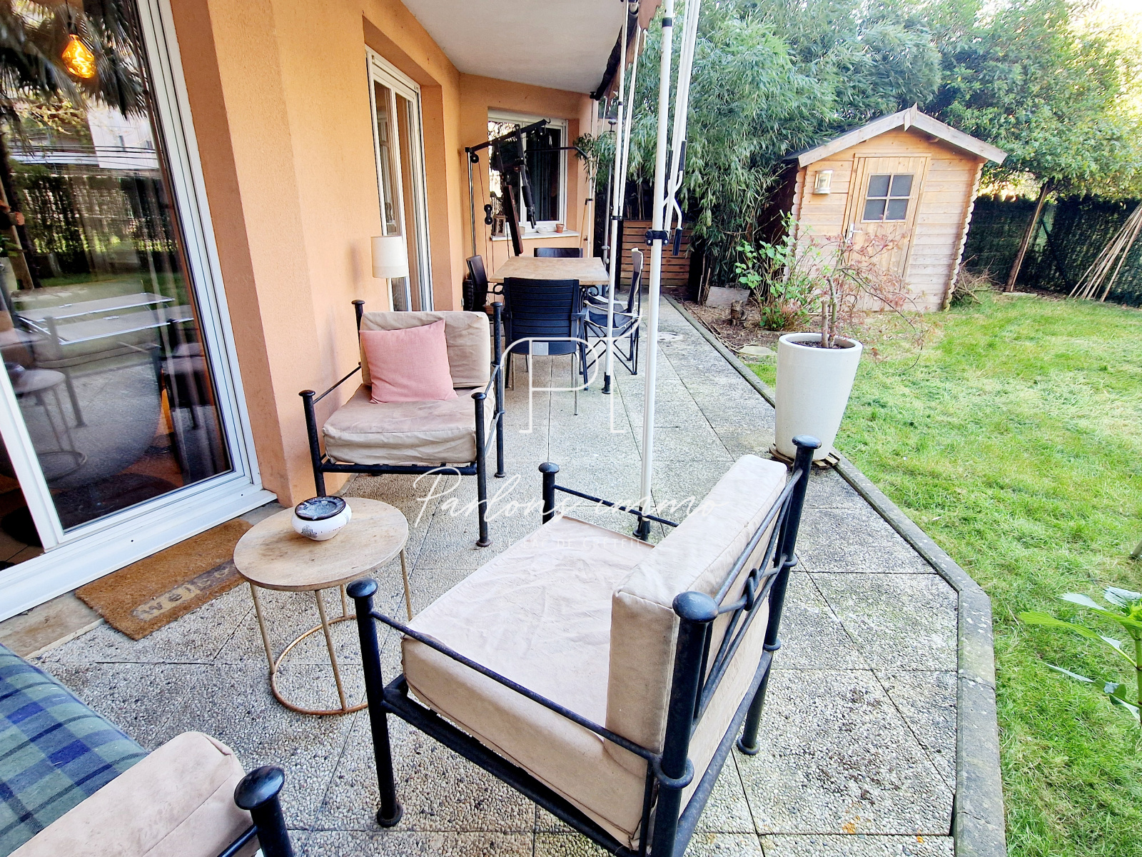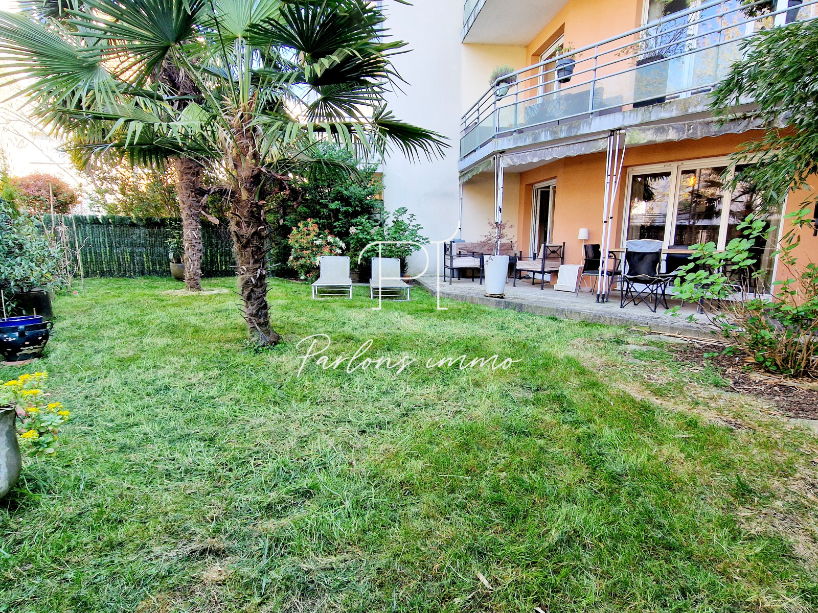 - Un magnifique jardin avec terrasse, cabanon et palmier